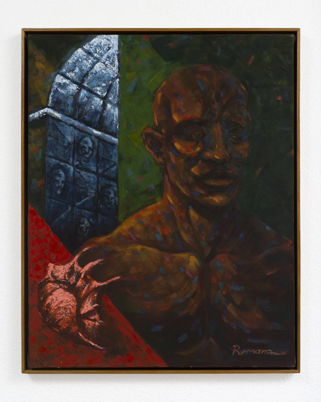 A figura mítica toma protagonismo nessa obra melancólica e voraz. Trazido das história do homem ocidental, a figura imponente do homem negro tensiona o espaço, o desejo e olhar para novas intersecções imaginativas.