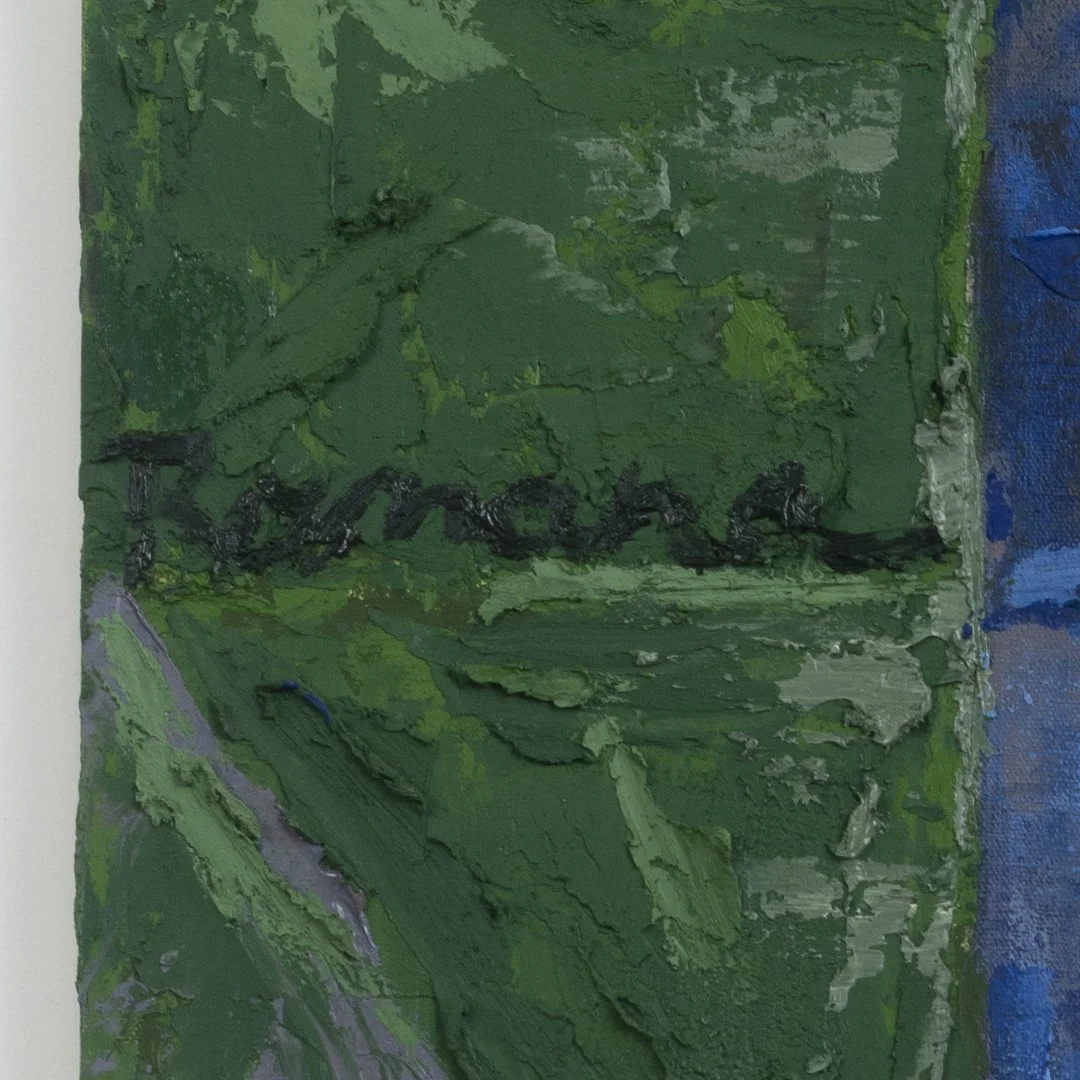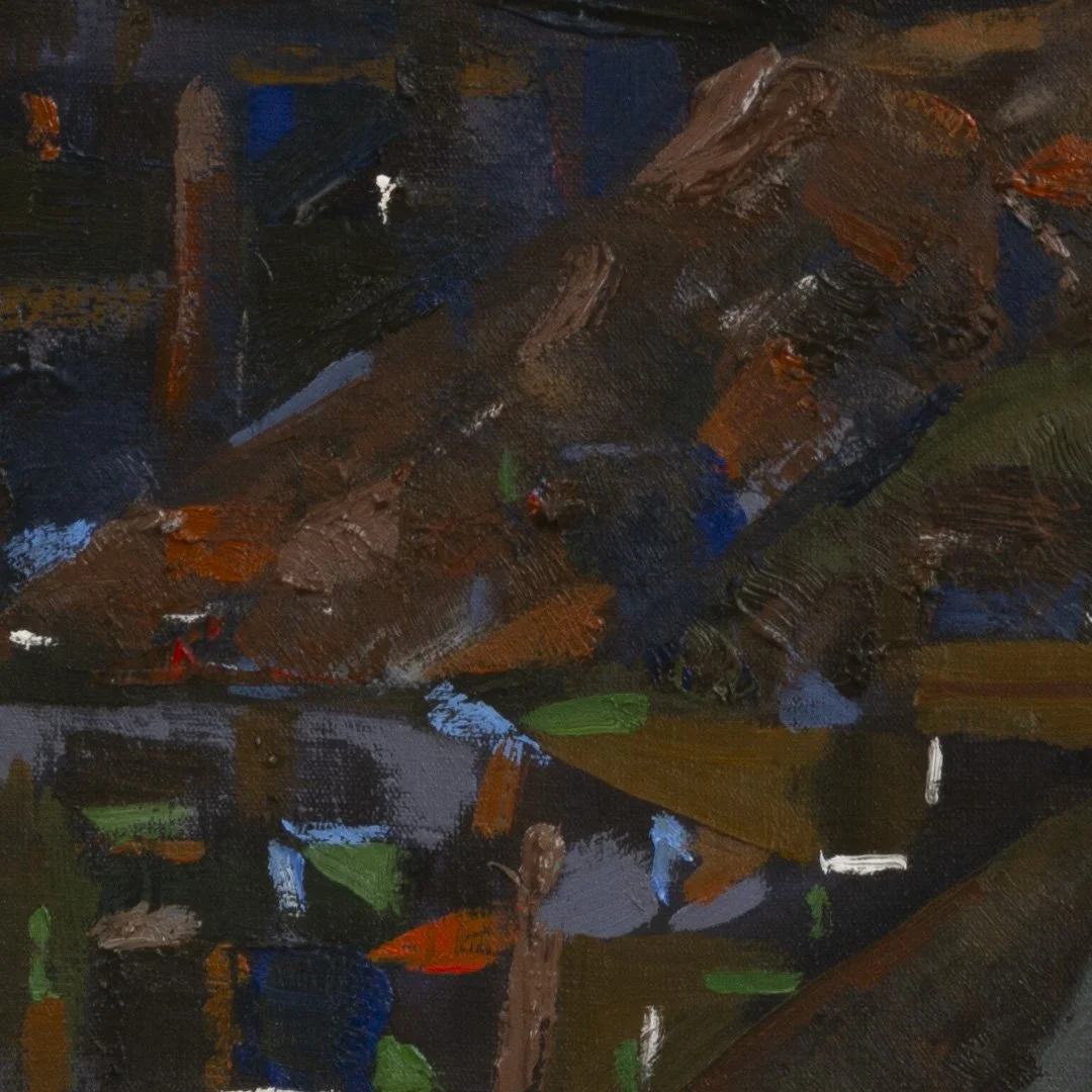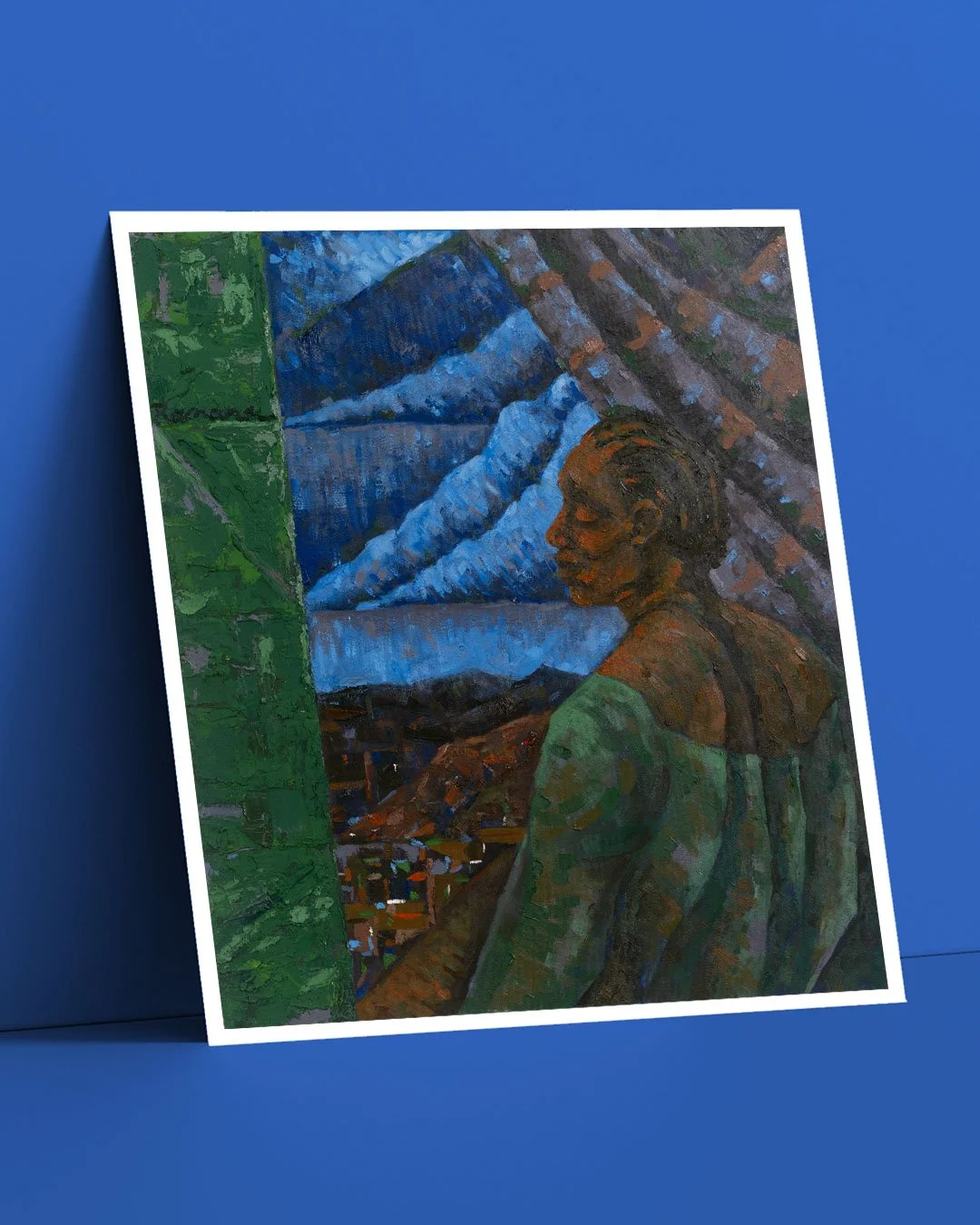 Feita no início de 2023, a obra traz o olhar de uma figura que direciona o espectador para a esquerda, refém do movimento de retorno que a composição propõe. Esse olhar, que não consegue avançar da esquerda para a direita, só encontra alívio no espaço entre a profundidade das colinas e nuvens ao fundo, que preenchem grande parte da obra.